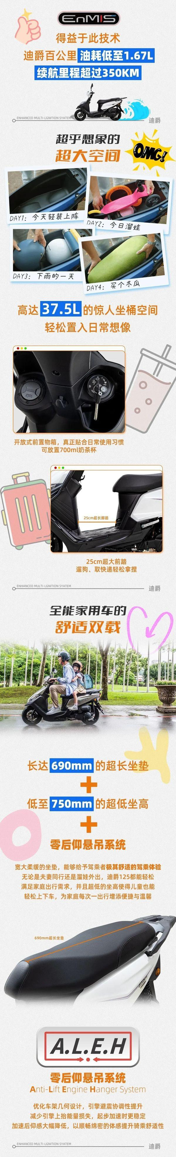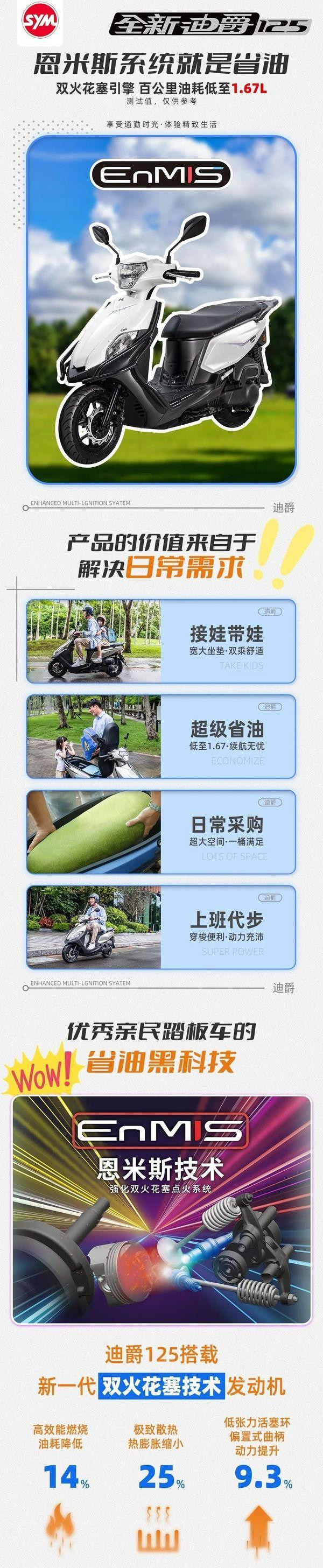 另一方面,恩米斯技术2次点火,也能更好的降低油耗,官方数据:迪爵125油耗63.9km/L,加满油可从台北跑到高雄(约370公里)。