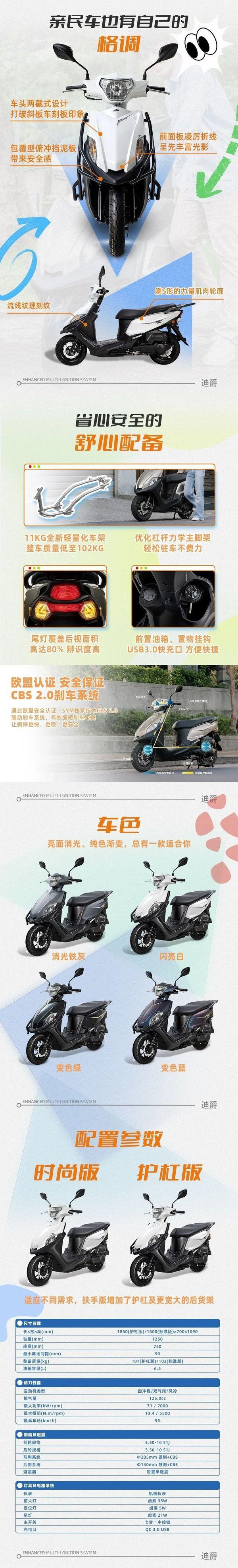 最近,三阳正式发布了迪爵125,售价上分别为时尚版7980元,护杠版8280元,而且现在到1月31日购车可赠送迪爵专属头盔一顶,这台车有2大卖点——1是恩米斯双火花塞异步点火技术,油耗更低动力更好,2是这台车是目前国内在售125踏板里面,马桶空间最大的,足足37.5升,比LEAD125还大了0.5升,但迪爵125比LEAD125可是便宜了太多了。
